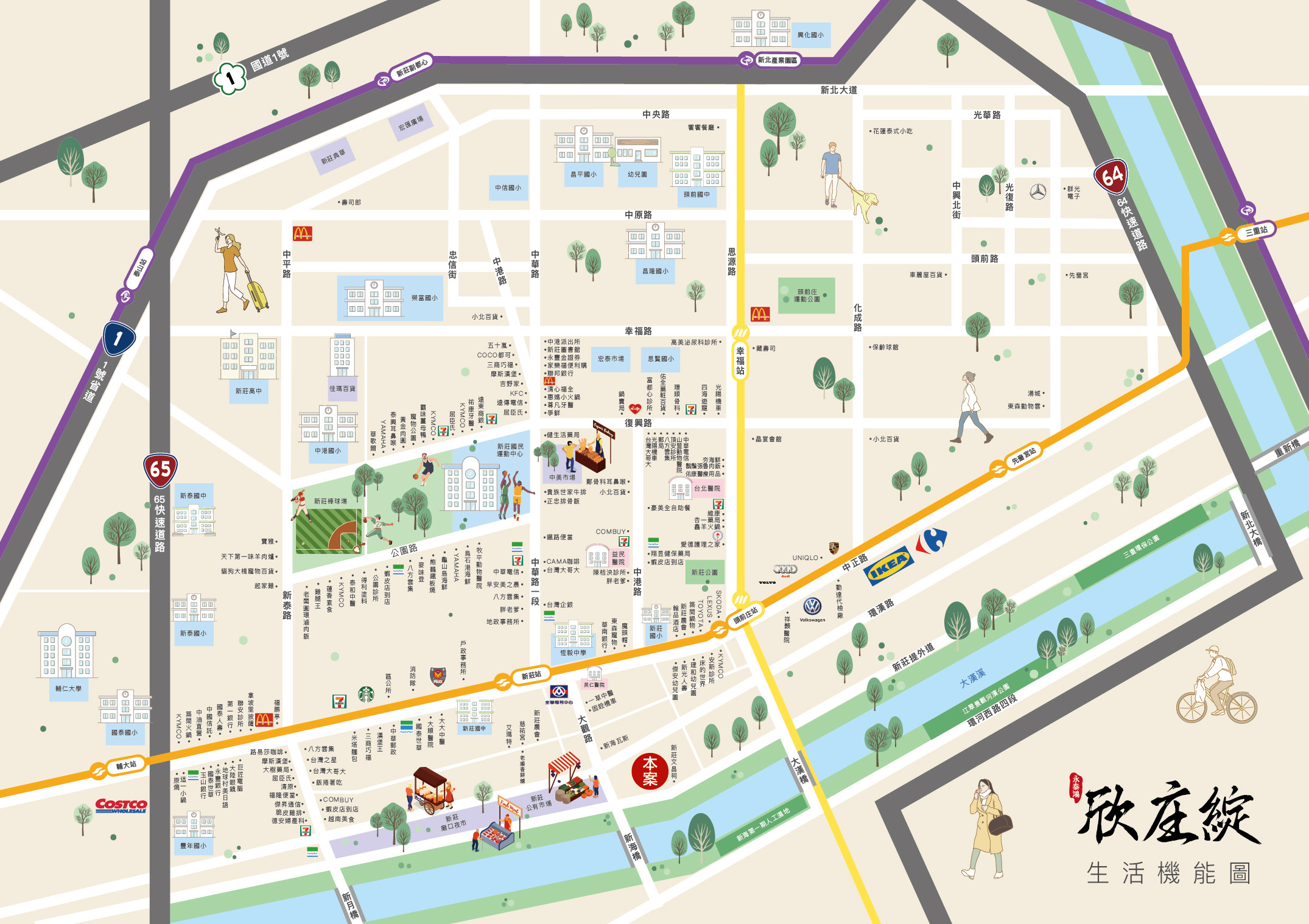 交通:新莊捷運站約5分鐘、台65、台64、國道三號。12年就學免奔波、購物採買好便利:全聯大觀店、家樂福、傳統市場,都是步行數分鐘距離